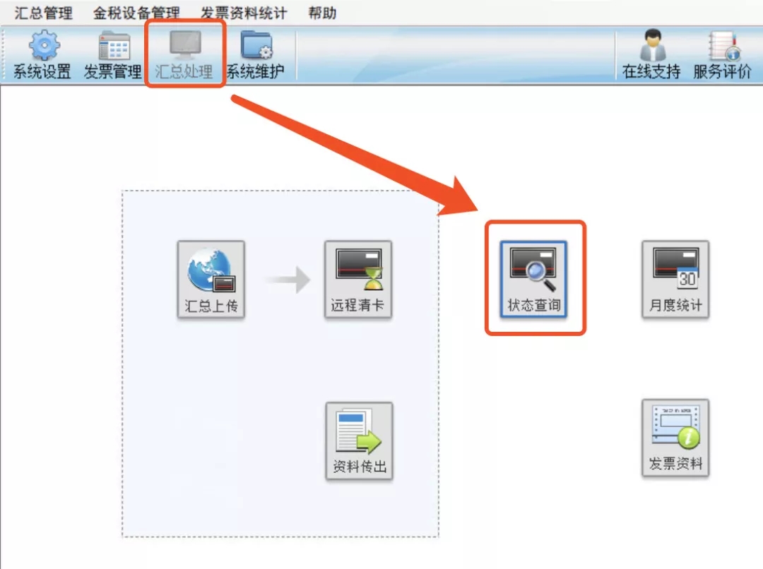 操作流程:點(diǎn)擊【匯總處理】-【狀態(tài)查詢(xún)】-【增值稅專(zhuān)用發(fā)票及增值稅普通發(fā)票】。